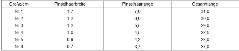 - Pinselgröße: siehe Tabelle