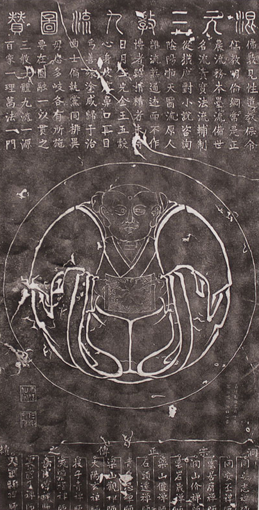 Das Bild wurde in der Ming-Dynastie von Zhuzai Qing als Steinmeißelarbeit angefertigt. Beim genauen Hinschauen sind drei Personen zu erkennen. In der Mitte steht der buddhistische Mönch Shijiamoni 释迦牟尼. Er hält die beiden anderen Personen in den Armen. Links, mit eckigem Haartuch, ist Konfuzius dargestellt. Rechts, mit einem Dutt im Haar, sieht man Laozi. Der Stein, auf den das Bild graviert wurde, befindet sich heute im Westen der Tausend-Buddha-Halle des Shaolin-Tempels.