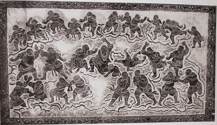 Berühmte Steinmetzarbeit aus der Ming-Dynastie, entstanden in der Blütezeit der Shaolin-Kultur. Das Bild zeigt Mönche bei ihren Kampfübungen. Lohan ist die chinesische Bezeichnung für Arhat (Sanskrit).